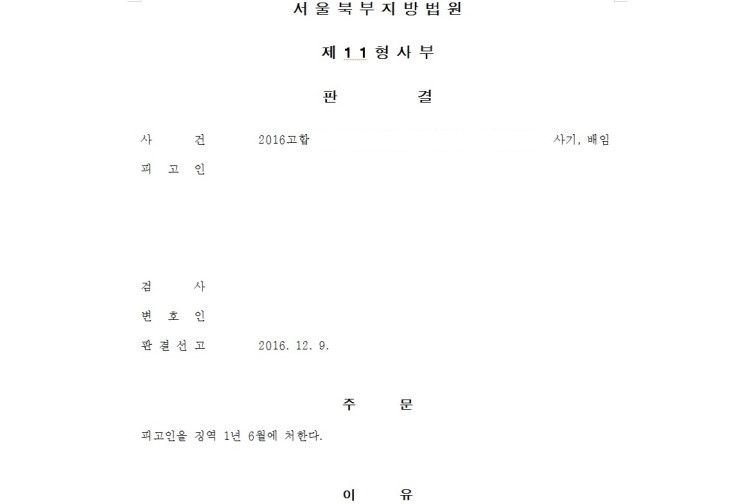 4. 자칫 단순 민사문제로 취급될 수 있었지만 차용 당시의 자금 상황 등에 관한 자료 등을 적극적으로 제출하여 결국 피고인에 대하여 다른 경합범 관계에 있는 죄들과 합하여 징역 1년 6월의 실형이 선고된 사안(법정구속).