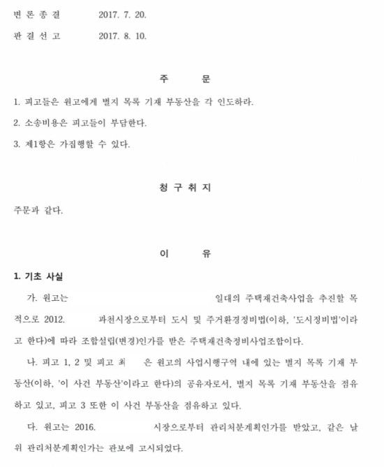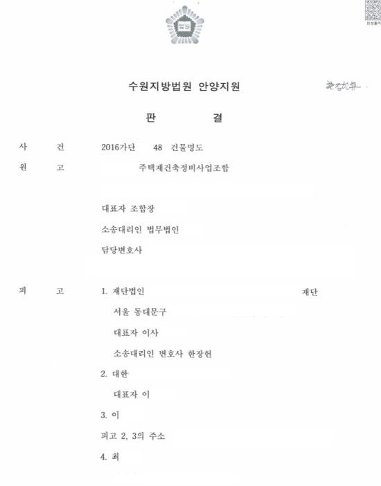 그러나 실상은 원고인 재건축조합의 명도청구에 대하여 무대응으로 일관하다가 변론의 종결 후 변론재개신청을 하는 방식으로 대응 시간을 길게 가져가면서 결국 사업을 빨리 진행해야 하는 입장인 재건축조합 측으로부터 유리한 합의안을 도출해낸, 실질적으로는 승소에 준하는 사안입니다.