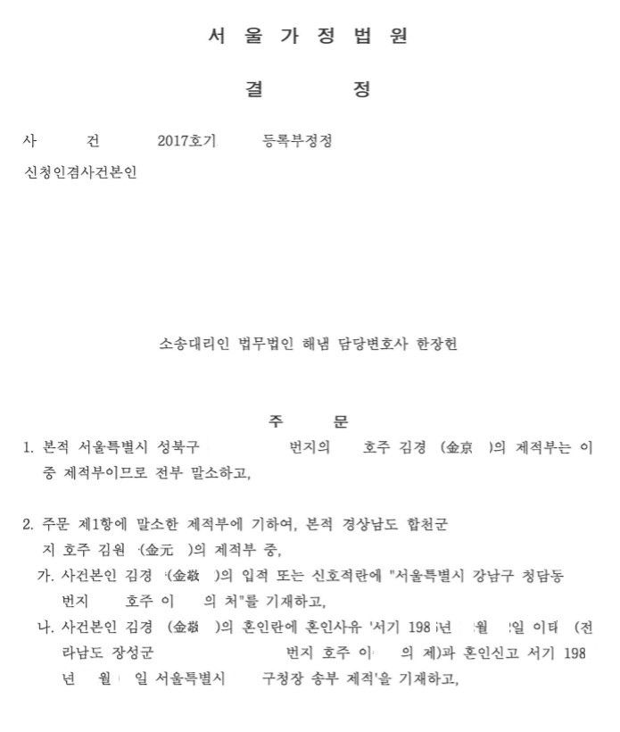 이에 그 이중 가족관계등록부 정정을 위해 저를 찾아주셨고, 친생자관계존재확인소송부터 등록부정정에 이르기까지 약 8개월이 걸렸지만 무리 없이 해결에 이르렀습니다.