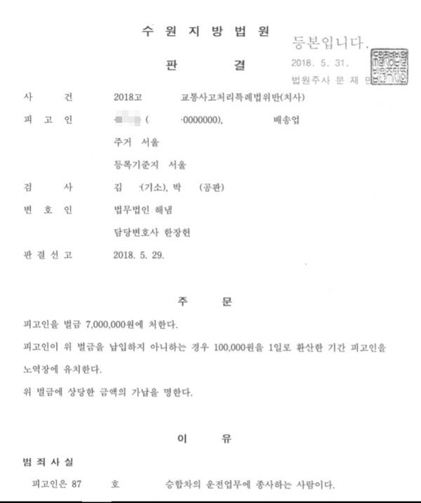 이 사건은 교통사고처리특례법위반(치사), 즉 교통사고 사망 사건에 대하여 벌금형 선고를 받은 사안입니다.