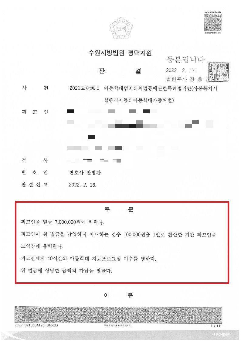 변호인의 2차례의 경찰조사, 검찰 조사, 3차례의 재판 등 수사와 재판, 증인신문, 합의 등을 진행하여 검사의 실형 구형에도 불구하고 의뢰인의 구속 및 실형을 막았습니다. 아동 학대의 경우 처벌 수위가 높고 추후 민사소송 진행 가능성이 있기에 합의 진행도 매우 중요한 부분입니다.