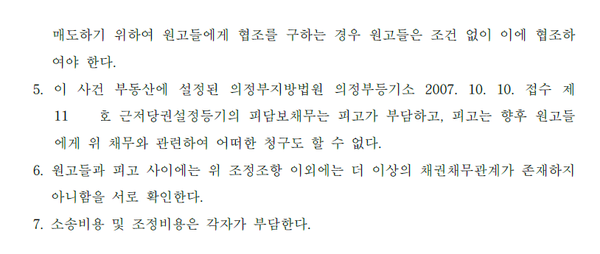 한장헌 변호사는, 등기 기재상 채무자 명의가 피고로 되어 있는 점, 은행의 대출서류 상 원고들의 피상속인은 물상보증인으로만 되어 있는 점 등을 적극적으로 주장하여 결국 조정 과정에서 피고는 그 채무 전액을 자신이 전부 부담하는 것으로 정리하였고, 원고들은 그 부동산의 시세만큼 금액을 정산 받는 방식으로 공유물분할이 이루어졌습니다.