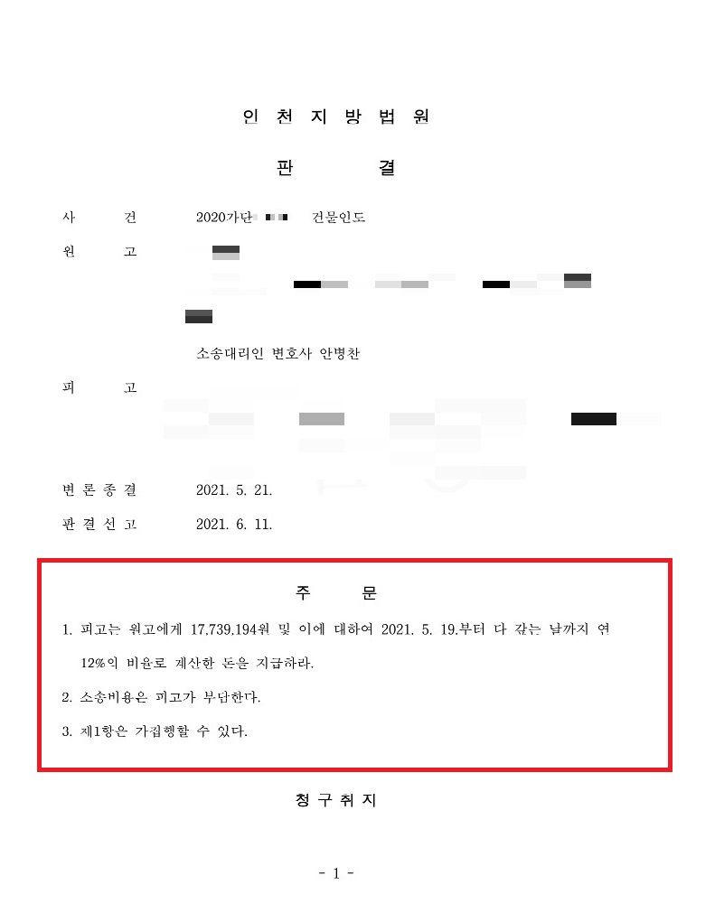 의뢰인은 명도단행가처분 인용으로 건물을 인도받은 후 원상회복 및 손해배상 청구금액 전부 받아내는데 성공하였습니다. 추후 소송비용확정심판을 통해 변호사 비용도 청구하였습니다.