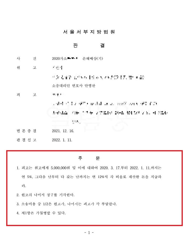 원고는 청구금액 중 500만원이 인용되었습니다. 상대방 남성은 허세와 달리 자력이 부족하여 금액은 다소 감액되었지만 일반적인 자력이 있는 경우였다면 더 많은 금액 인용받았을 것으로 보입니다.