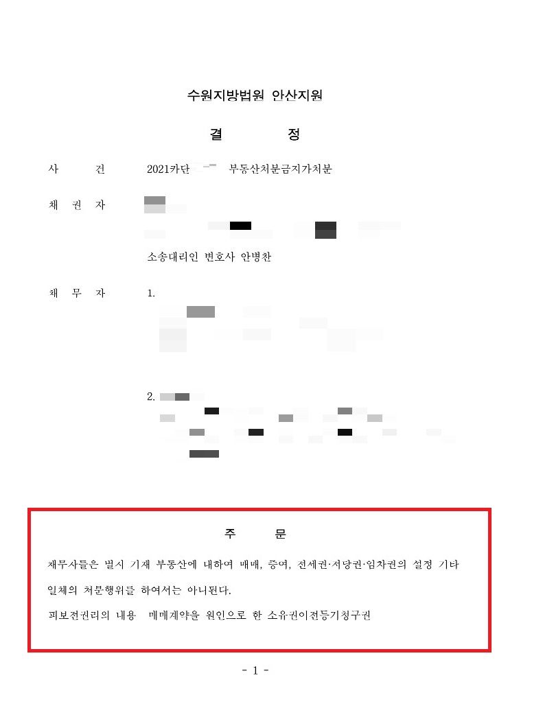 의뢰인은 부동산처분금지가처분 신청은 피보전권리와 보전필요성이 인정되어 인용결정을 받았습니다.