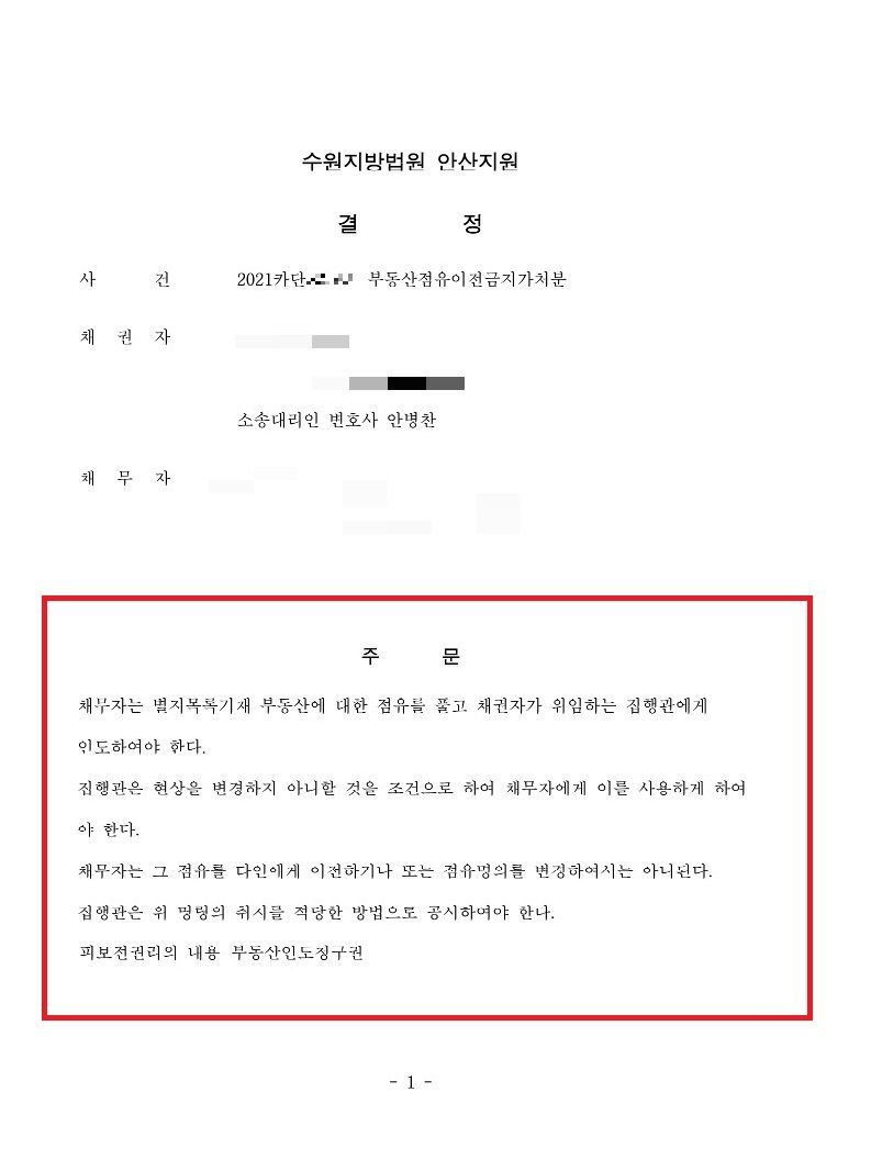 의뢰인의 점유이전금지가처분 신청은 인용되었고 보증금은 보험증권으로 대체되었습니다.