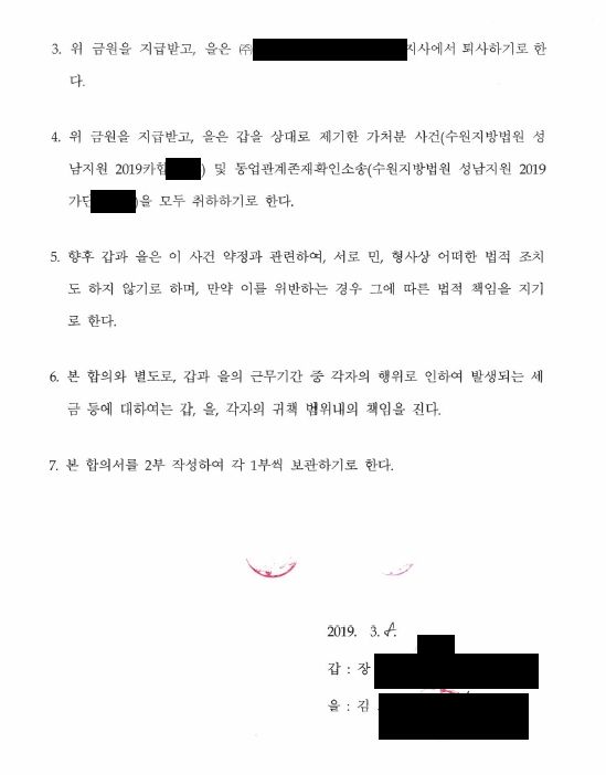 한장헌 변호사는, 민법상 조합 관계에 관한 법리를 들어 조합원의 지위 확인을 구하는 소송과 업무방해의 금지를 구하는 가처분신청 절차를 진행하였고, 결국 동업관계는 정산하되, 을이 갑에게 일정 손해를 배상하는 것으로 사건을 정리하는 취지의 합의서를 이끌어 냈습니다.