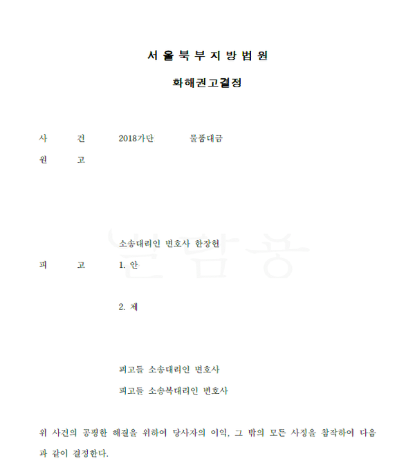 위 사건은 물품대금청구소송으로 승소에 준하는 화해권고결정을 받은 사건입니다.