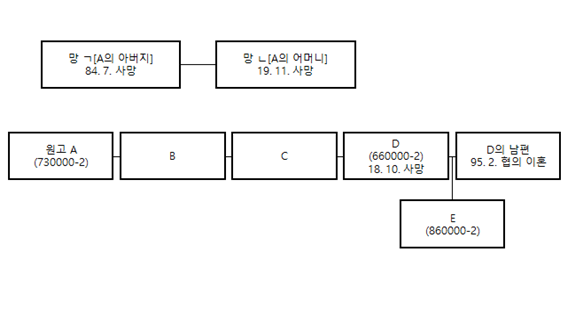 의뢰인인 원고는 위 표에서 보이는 것과 같이 망 ㄴ[A의 어머니]의 자녀로 B, C, D와 함께 가족관계증명서에 등재된 자입니다. 이 중 D는 망 ㄴ과 친생자관계에 있지 아님에도 불구하고 자녀로 등재된 자입니다.