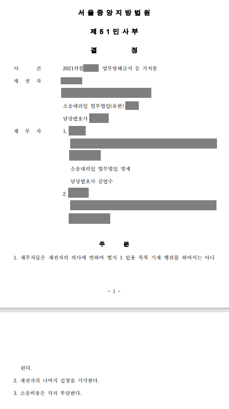 의뢰인은 가슴 성형수술을 받았으나 양쪽 가슴의 유두 위치 및 높이가 다르고 가슴에 굴곡이 생기는 등 부작용이 발생하자 재수술 또는 피해 보상을 요구하며 병원에 항의를 하였습니다. 그러나 병원은 이를 거부하였고 의뢰인이 인터넷 게시판에 글을 작성하면서 동시에 병원 앞에서 피켓 시위를 하자 병원은 법원에 업무방해금지 가처분을 신청하였습니다.