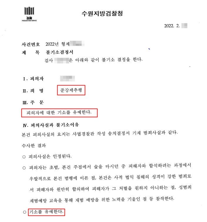 성범죄사건의 경우 기소유예 처분이 흔치 않을 뿐만 아니라 기소유예 처분이 내려지더라도 대부분 성범죄 예방에 관한 교육이수조건이 따라 붙는다는 점을 감안한다면 조건 없는 기소유예 처분은 매우 이례적인 결정이었습니다.