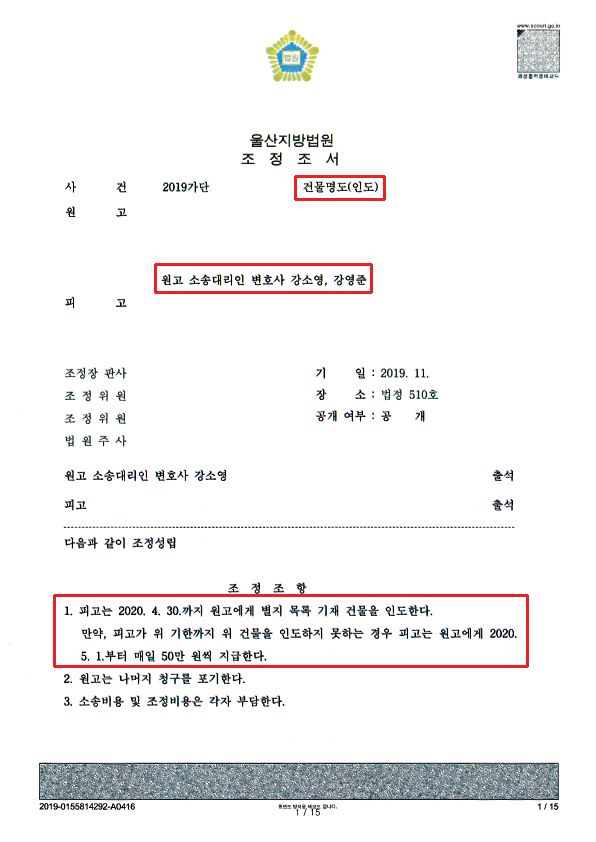 본 사무실의 도움으로 소송 전 점유이전금지가처분을 인용 받고, 소송 제기 후 건물인도하기로 조정을 통해 해결하였습니다.