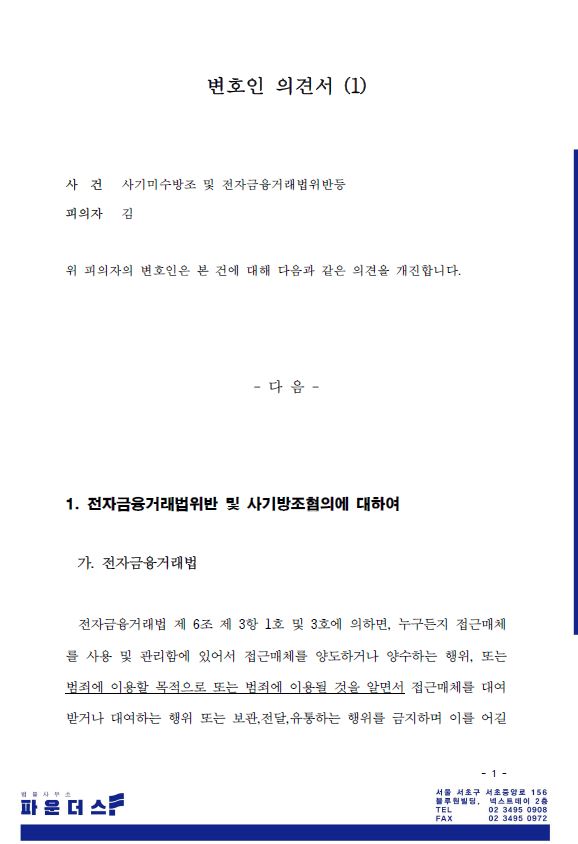 위 사건 이후 의뢰인은 전자금융거래법위반 및 사기방조혐의를 받고 경찰조사를 받을 처지에 놓였고, 해당 사건을 법률사무소 파운더스 하진규 변호사에게 의뢰한 것입니다.