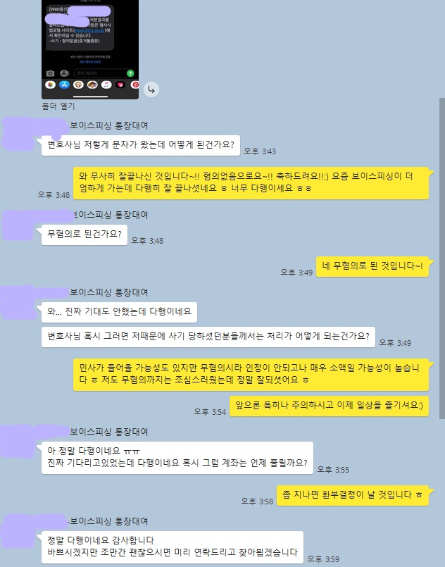 이러한 경우 보이스피싱 범죄에 대하여 정확히 몰랐다 할지라도 보이스피싱에 가담하는 것에 대해 미필적 고의를 인정하여 유죄를 선고하는 경우도 많습니다. 다만, 위 사례처럼 자신도 모르게 억울하게 범죄 혐의를 받고 있다면 수사 초기부터 경험이 풍부한 변호사의 도움을 받아 조사를 받는 것이 중요합니다.