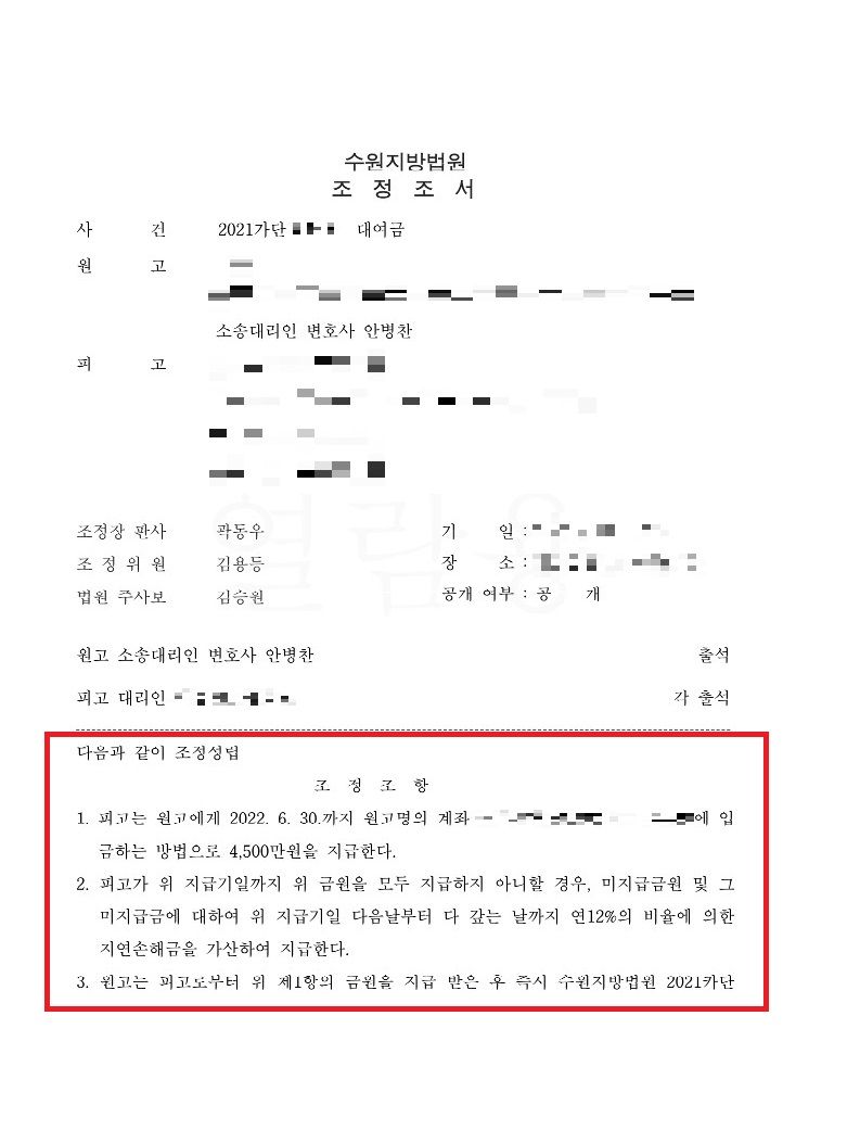 의뢰인은 대여금과 이자 중 상당부분을 받은 조건으로 임의조정에 성공하였습니다.