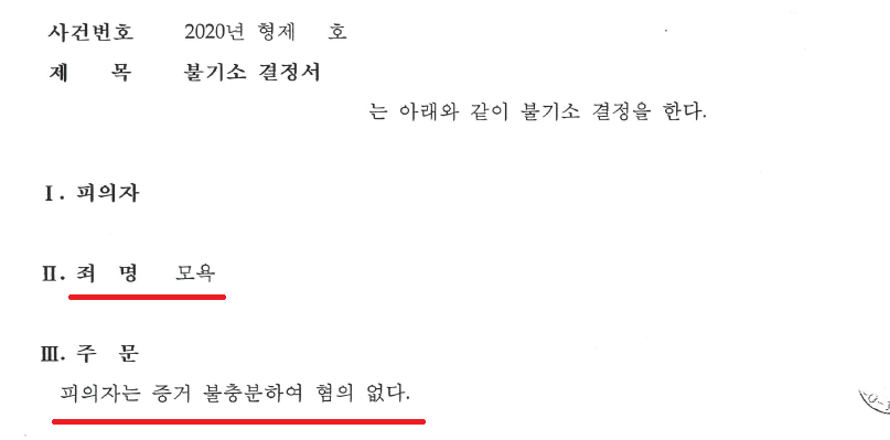 수사기관은 본 변호인의 주장을 받아들여 의뢰인의 모욕 혐의에 대하여 혐의없음(증거불충분) 처분을하였습니다.