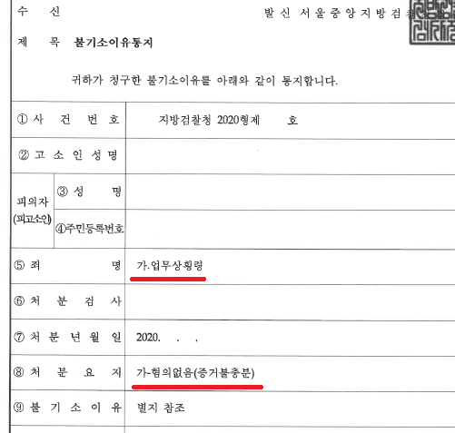 검찰은 본 변호인의 주장을 받아들여 의뢰인의 업무상횡령 혐의에 대하여 혐의없음(증거불충분) 처분을하였습니다.