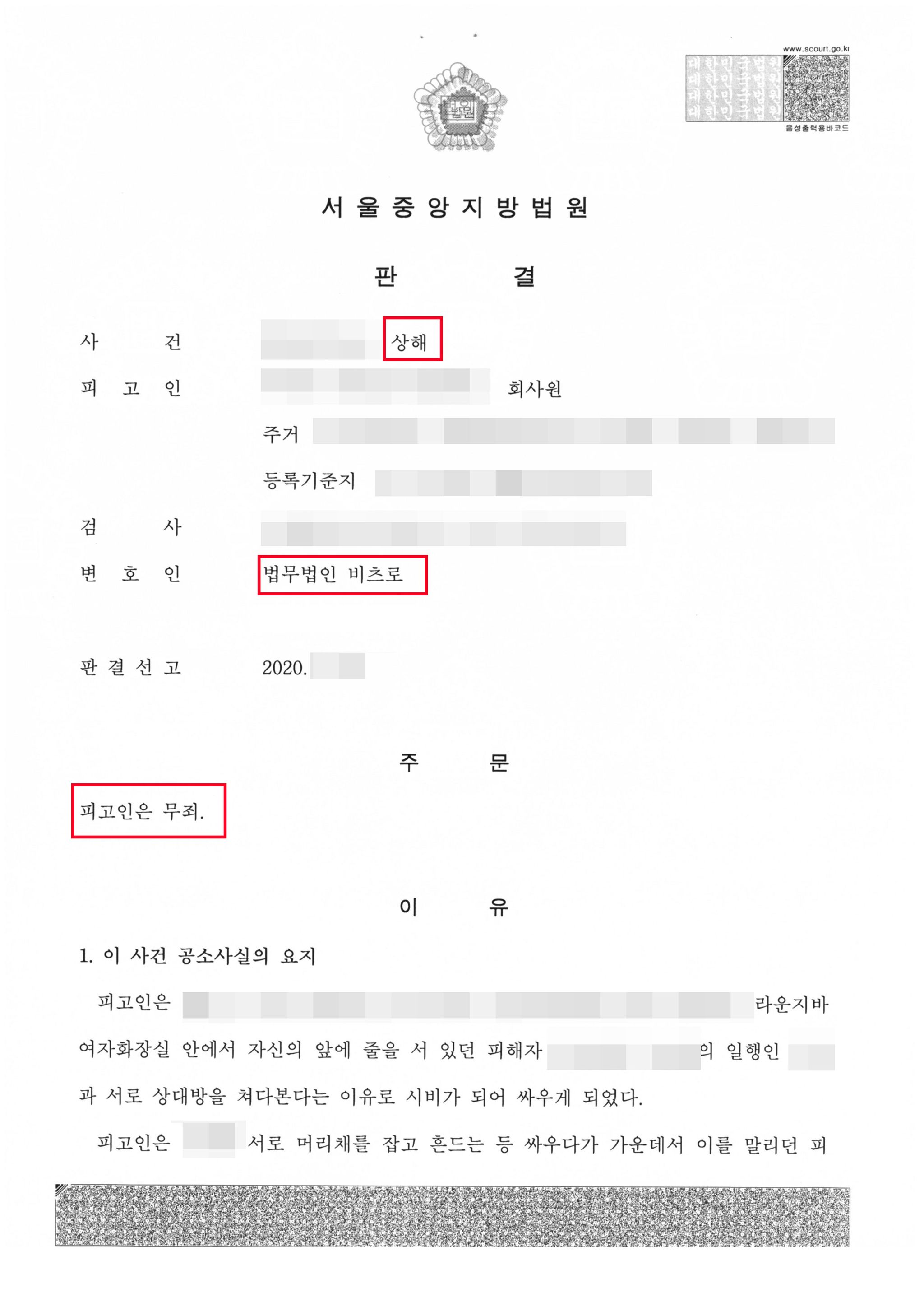 재판부에서 저희 변호인의 주장을 모두 받아들여, 사건 당시 정황을 볼 때 미필적으로나마 상해의 고의를 가지고 피해자의 이마를 할퀴었다고 보기 어렵다고 판단해 상해죄 혐의가 인정되기 어렵다며 무죄를 선고한 것이었습니다.