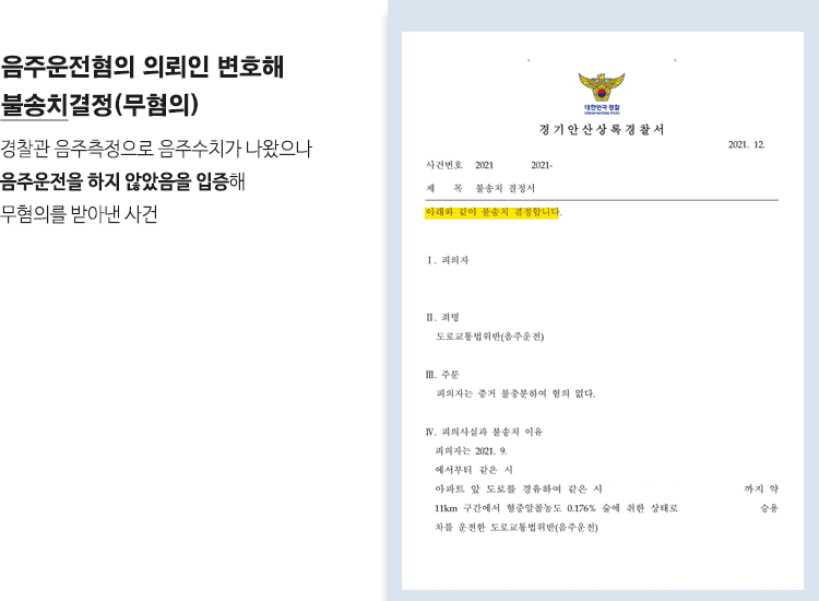 경찰은 조건명 변호사의 주장을 받아들여 사건을 불송치결정(무혐의) 하였습니다. 음주수치가 나왔음에도 불구하고 불송치결정을 받은 것은 매우 이례적인 일입니다. 법무법인 에이앤랩의 적극적인 사건 대응으로 의뢰인은 혐의를 벗을 수 있었습니다.