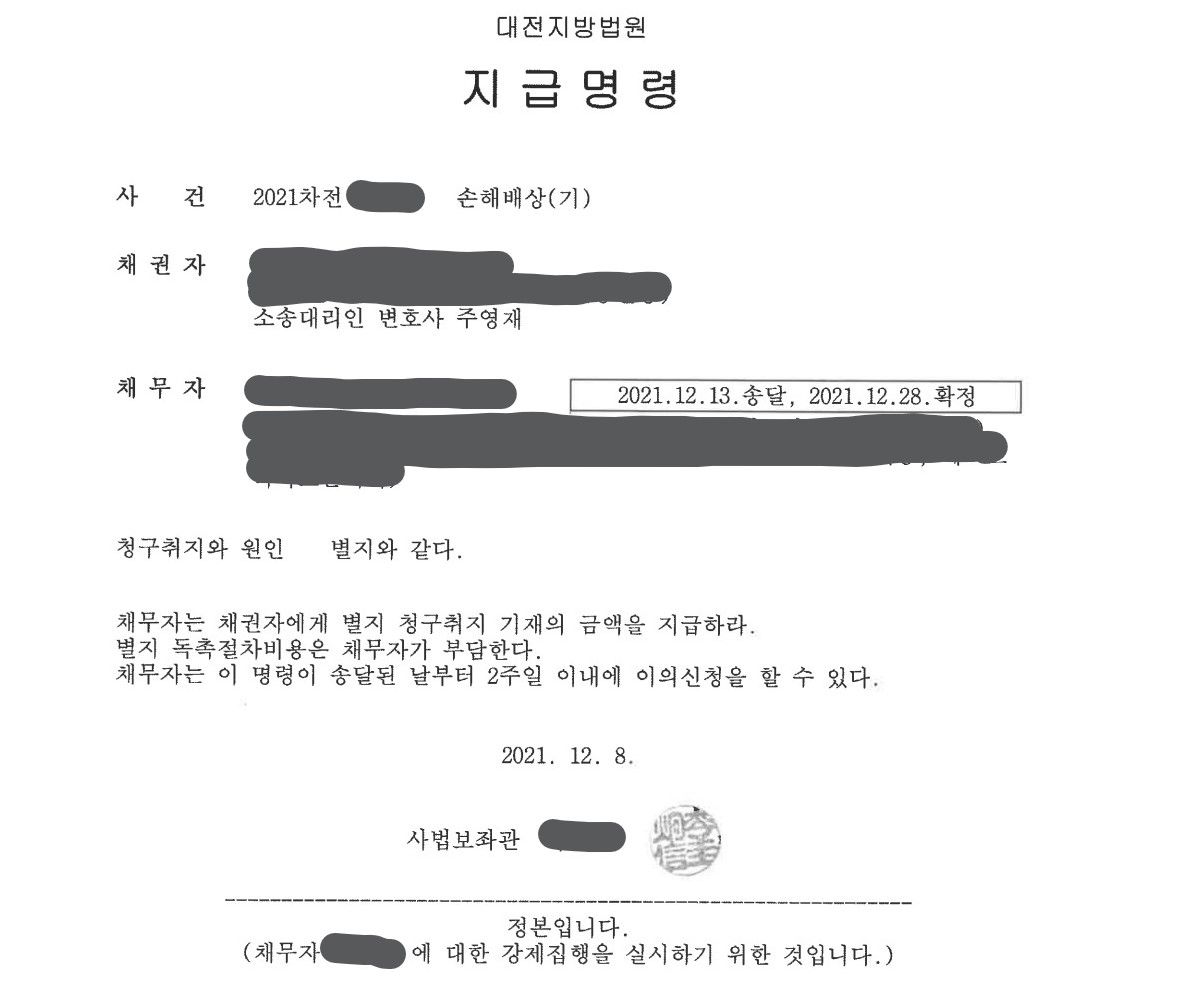 위 약식명령은 피고소인이 정식재판을 청구하지 않아 확정됐고, 주영재 변호사는 곧바로 손해배상을 구하는 지급명령을 신청해 지급명령 역시 확정됐습니다.