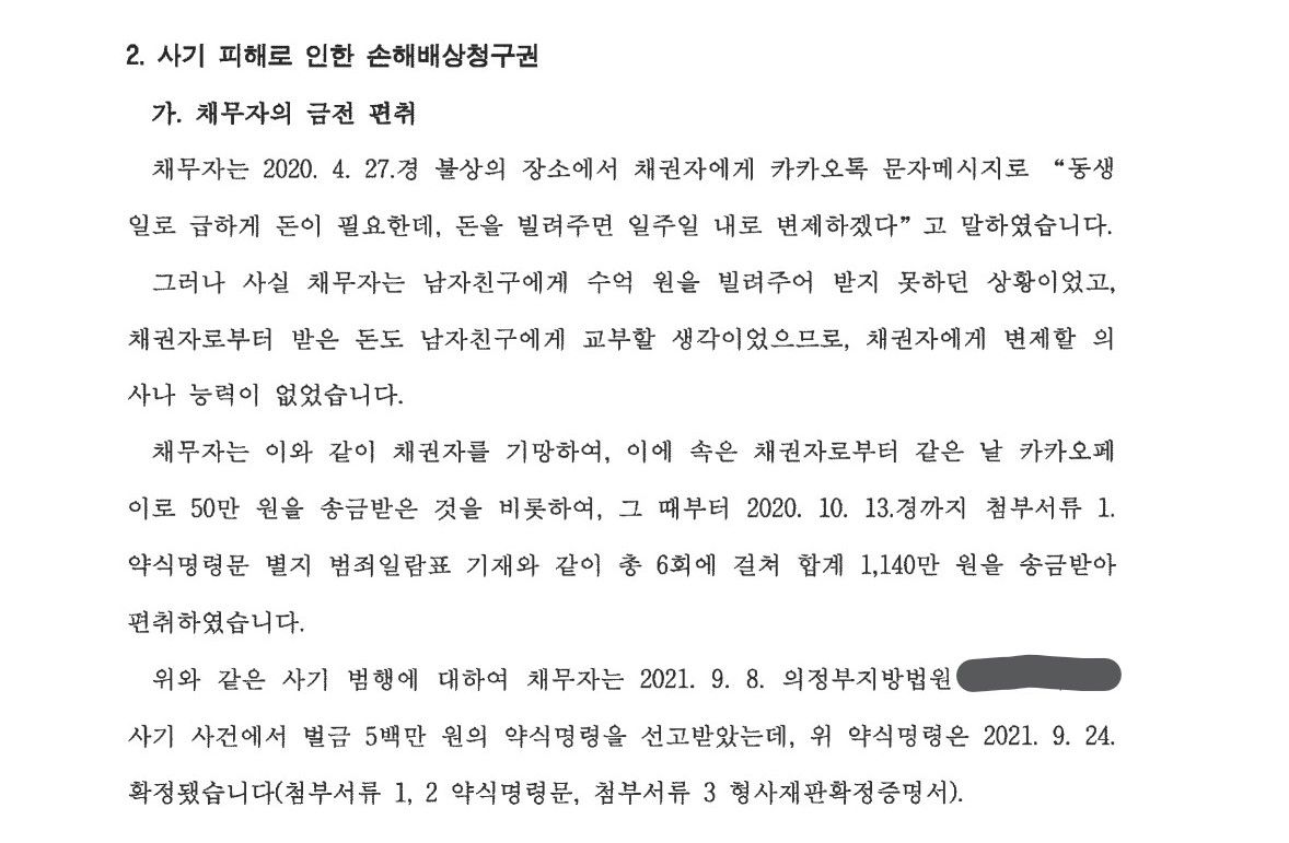 그 결과 주영재 변호사는 피고소인이 의뢰인에게 돈을 빌릴 당시 이미 부채가 상당하여 약속한 날짜에 변제할 능력이 없었고, 빌린 돈도 실제로 가족을 위해 쓴 것이 아니라 남자친구에게 갖다 준 것을 알게 됐습니다.