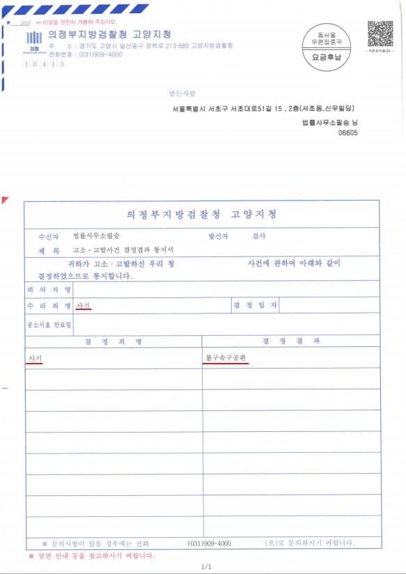 다만 사기죄는 합의가 이루어져도 죄가 인정되면 처벌도 이루어지기 때문에 의정부지방검찰청은 피의자를 불구속구공판(기소)하였습니다