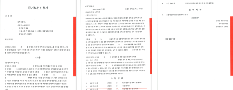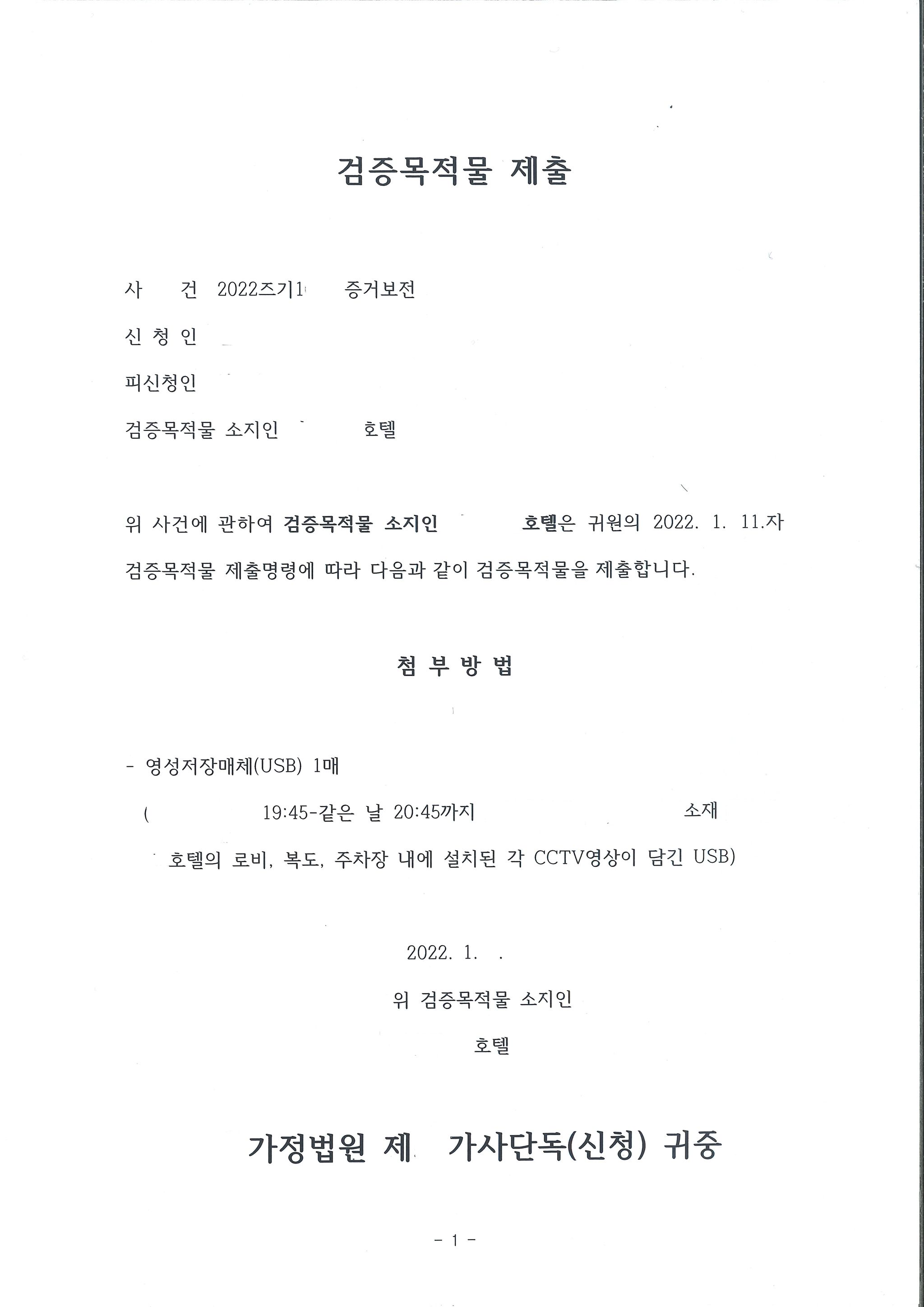 제 경우 호텔 측에서 어떻게 제출하여야 하는지 부담을 가질 수 있으므로 호텔 측에서 제출할 수 있도록 위와 같은 서면을 만들어서 USB를 가지고 찾아가 바로 영상을 USB에 담을 수 있었습니다. 원칙적으로는 증거보전신청을 해서 검증 절차를 거쳐야 하나 호텔 측에서 확보한 cctv 영상을 바로 증거로 제출하였습니다. 통상적으로는 cctv 영상에 부정행위를 한 자신들이 나오기 때문에 증거능력을 다투지 않아 별다른 문제는 없고, 다툴 경우 정상적인 증거보전신청을 통한 증거제출 방식으로 하면 되나 현실적으로 그런 경우는 없었습니다.