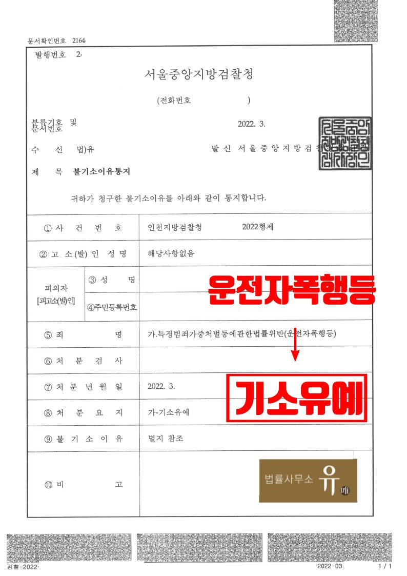 인천지방검찰청 부천지청은 법률사무소 유(唯) 형사전문변호사가 작성한 변호인의견서 내용을 받아들여 피의자(의뢰인)가 피해자와 합의하고 반성하면서 재발방지를 다짐하고 있는 점 등을 이유로 기소유예처분을 하였습니다.