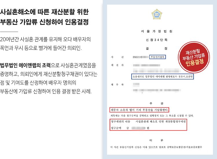 이를 위해 두 사람의 가족사진, 자녀를 함께 키운 사실, 주소지가 동일한 점, 주변인 진술 등을 확보하여 사실혼 관계임을 입증하였습니다. 또한 두 사람의 재산 내역을 파악하고, 재산 가액 및 우리 의뢰인의 기여도를 산정하였고, 이에 해당하는 금전의 보전을 위해 가압류 결정이 필요하다는 점을 강력하게 주장하였습니다.