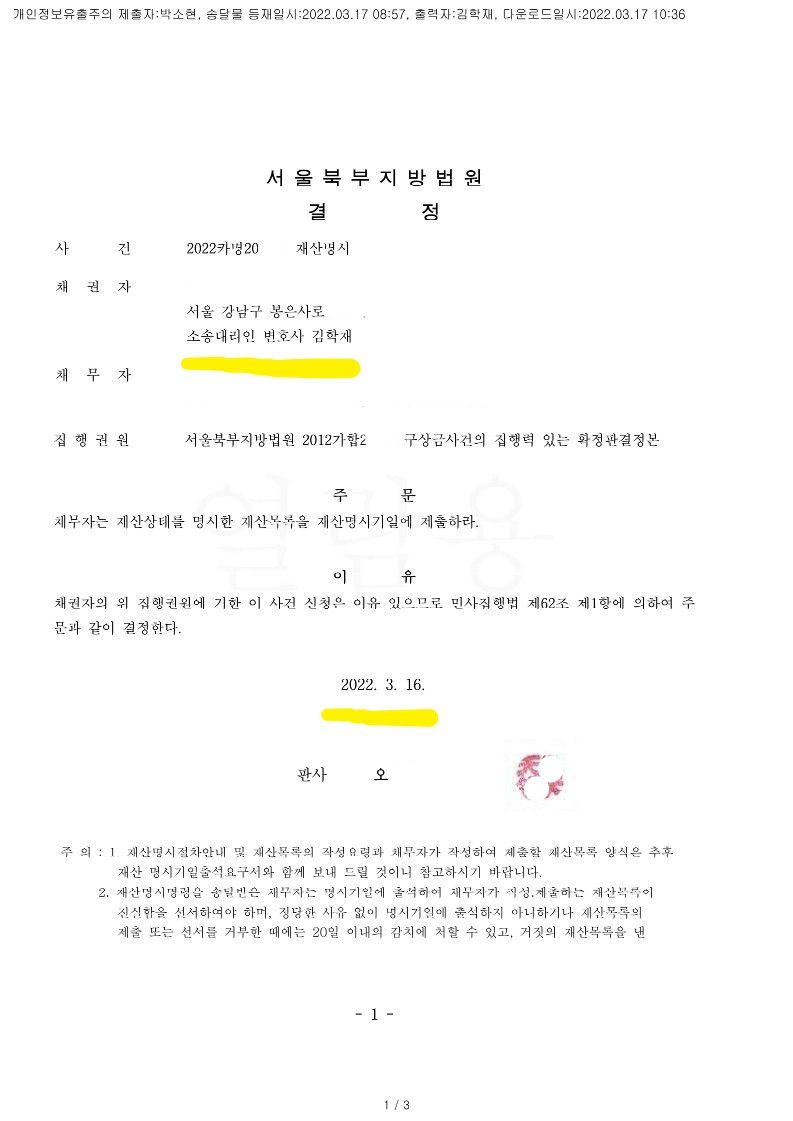 의뢰인분의 이러한 상황을 해결하기 위해서 재산명시신청을 진행하였고, 아래와 같이 재산명시결정을 받았습니다.