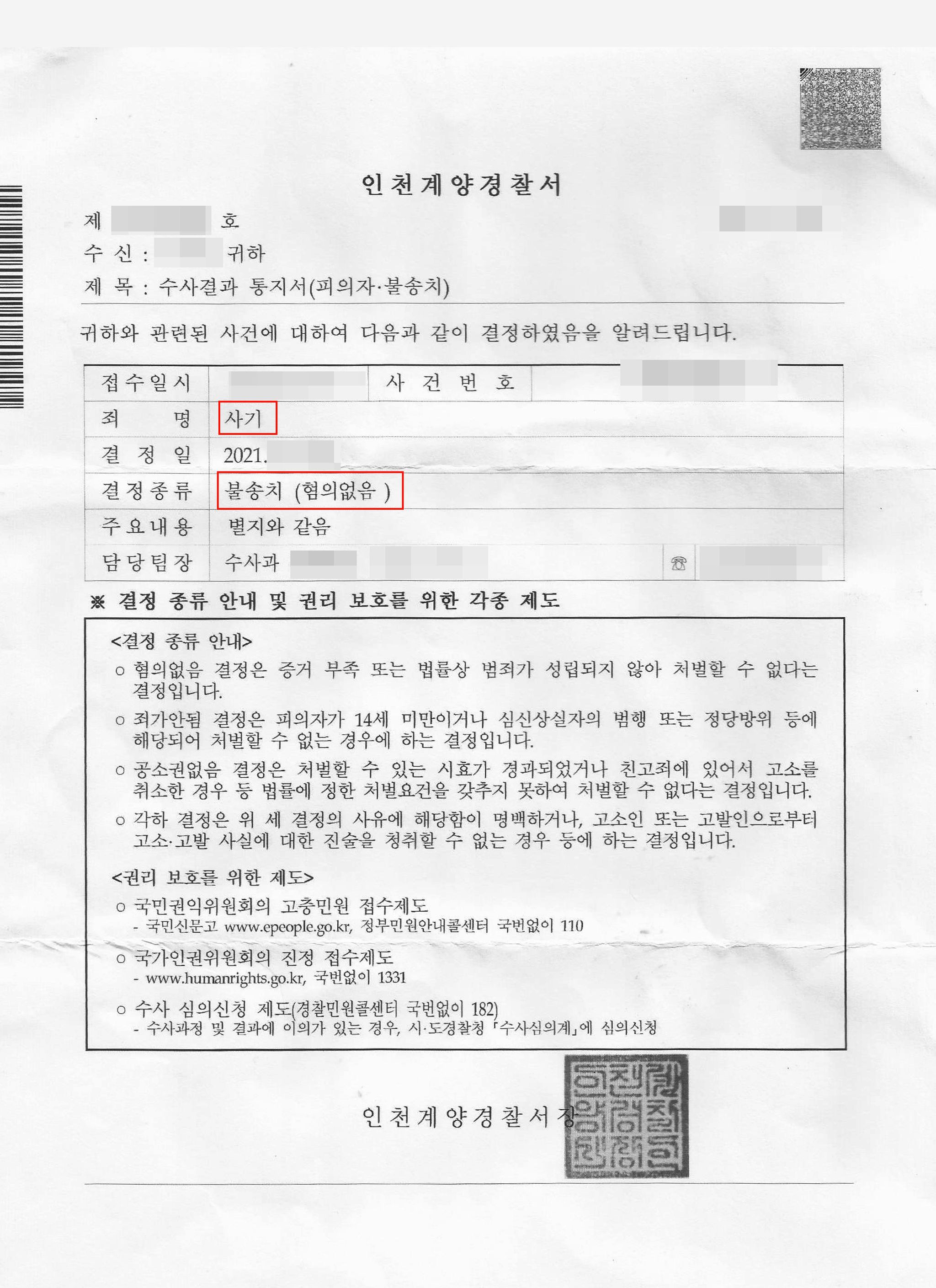 이러한 저희 변호인의 노력에 힘입어 의뢰인은 불기소처분(혐의없음)을 받을 수 있었습니다. 특히 의뢰인은 검찰단계까지 가지않고, 경찰단계에서 불기소처분 즉 혐의없음 처분을 받아냈습니다.