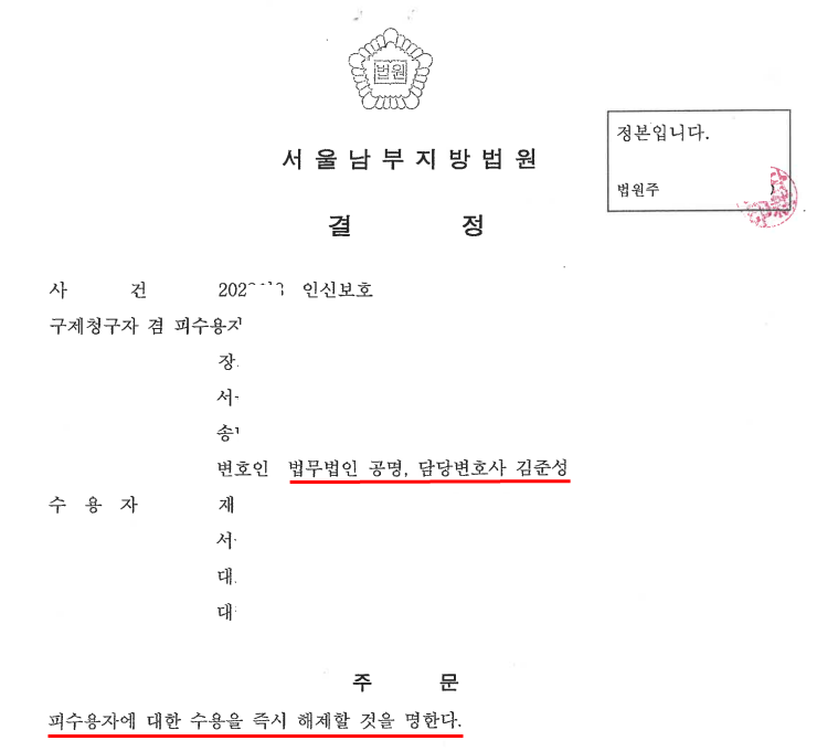 서울남부지방법원은 김준성 변호사의 위 주장을 받아들여 구제청구자에 대한 수용을 즉시 해제할 것을 명하였습니다.