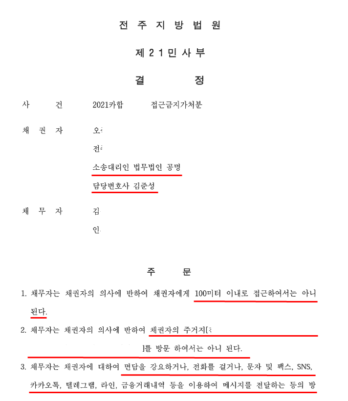 전주지방법원은 김준성 변호사의 위 주장을 받아들여 접근금지가처분신청 인용 결정을 하였습니다.