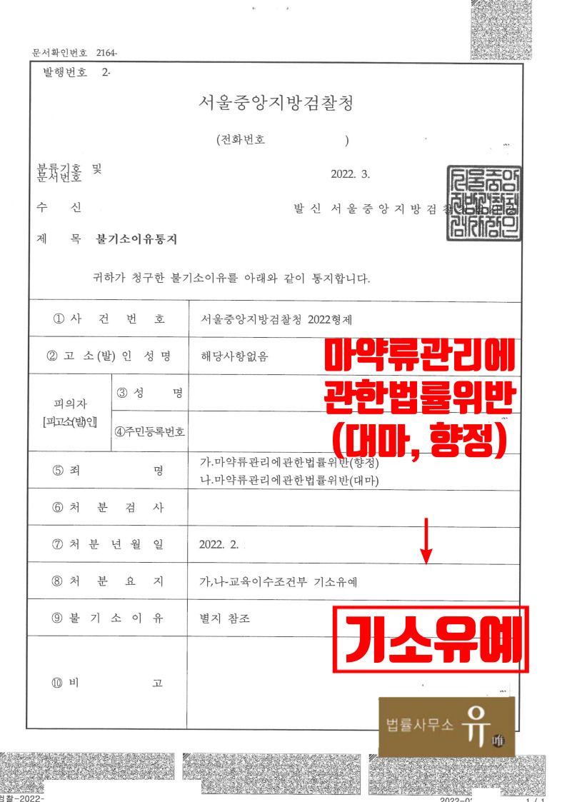 서울중앙지방검찰청은 법률사무소 유(唯) 마약전문변호사의 변호인의견서 등의 내용을 대폭 수용하여 피의자(의뢰인)에게 기소유예 처분을 하였습니다.