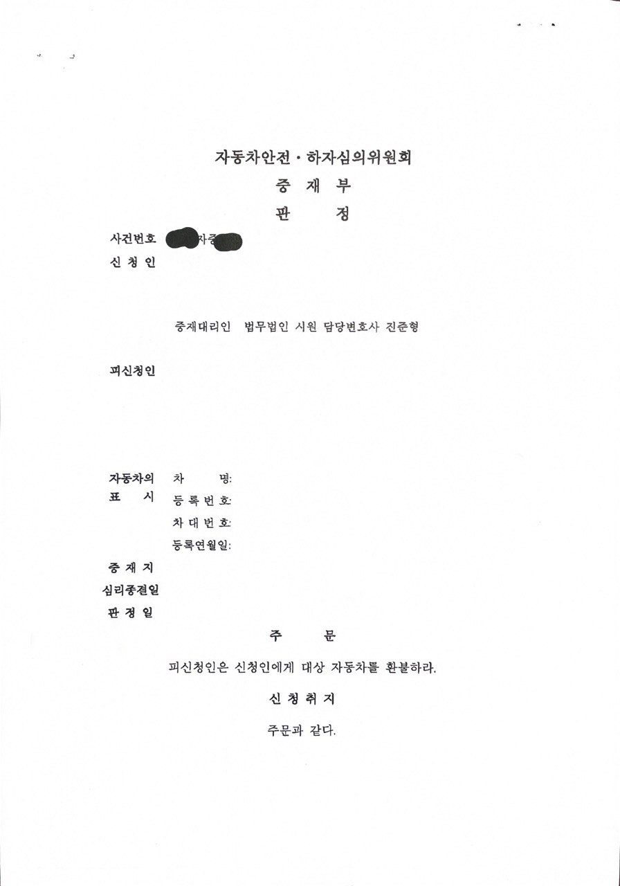 본 사안은 당사자가 직접 자동차 환불 중재 신청을 했다가 2번이나 각하 판정을 받은 후에야 법무법인 시원의 진준형 변호사를 선임한 사건이었습니다.