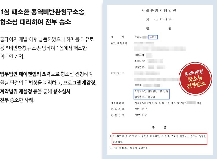 재판부는 신상민 변호사의 철저한 입증을 통한 주장을 모두 인정하였고, 1심판결을 파기하고 우리 의뢰인이 피항소인에게 지급할 용역대금이 없다는 전부 승소 판결을 하였습니다.