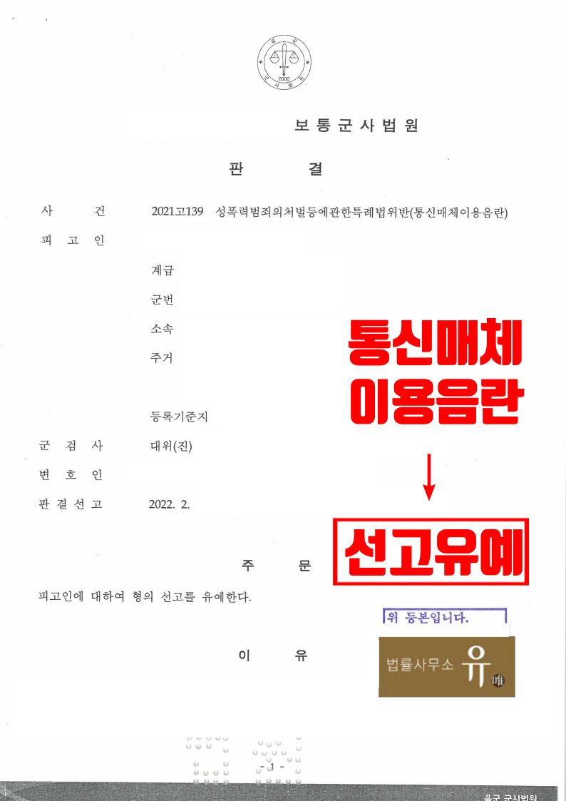 제2작전사령부 보통군사법원은 법률사무소 유(唯)의 형사전문변호사가 작성한 변론요지서 등의 내용을 반영하여 선고유예 판결을 하였습니다.