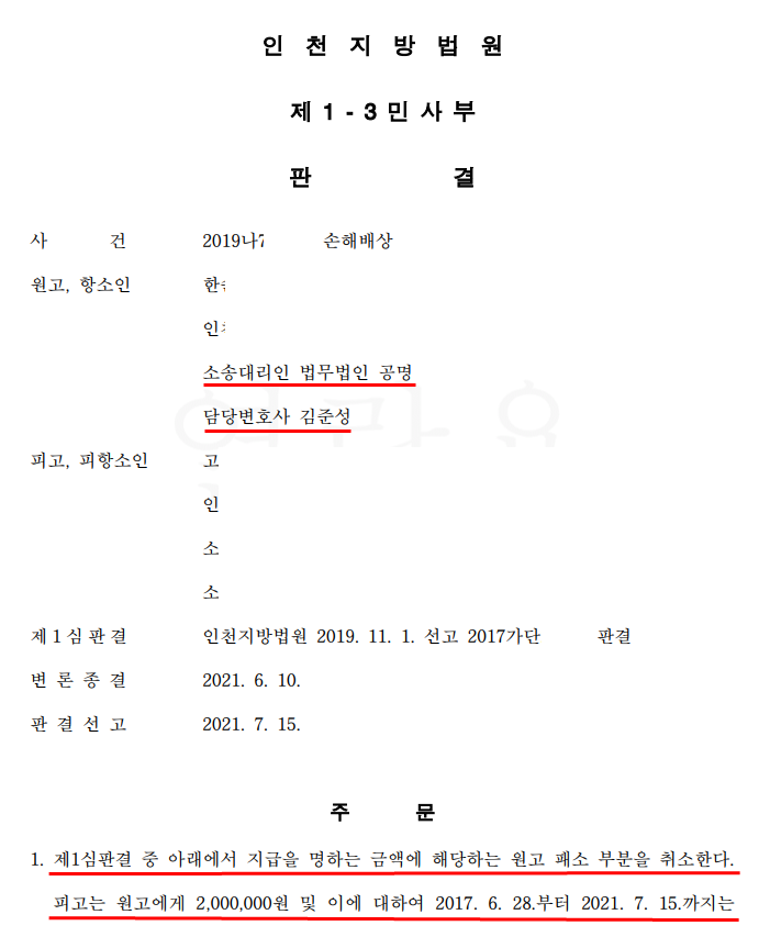 인천지방법원은 원고의 위 주장을 받아들여 피고는 원고에게 2,000,000원을 지급하라는 판결을 선고하였습니다. 이 사건은 1심에서 의뢰인분이 다른 변호사와 사건을 진행하여 전부 패소했던 사안인데 본 변호사가 2심을 맡아 일부 승소한 사안입니다.