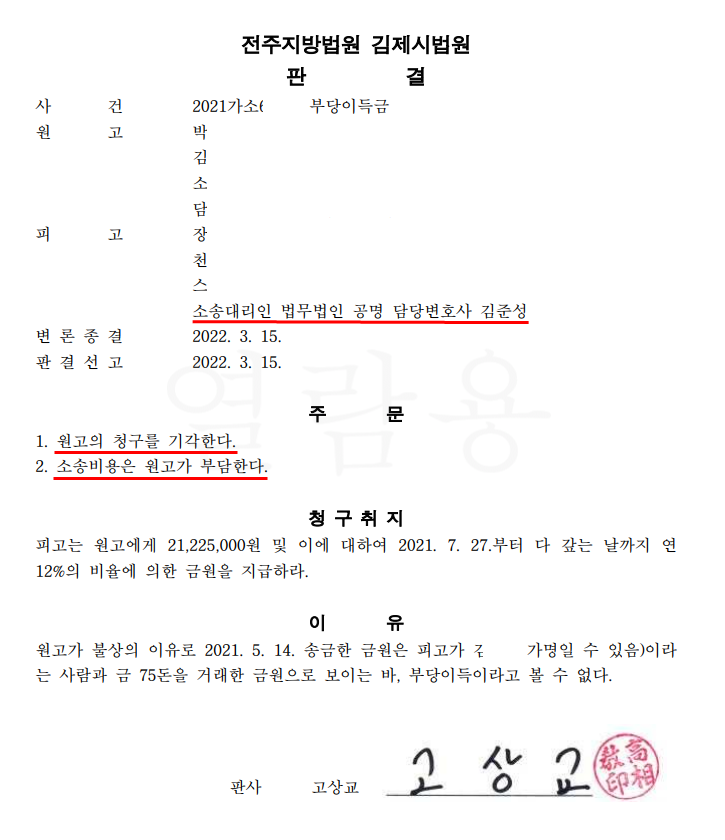 * 사건번호 : 전주지방법원 김제시법원 2021가소**** 부당이득금