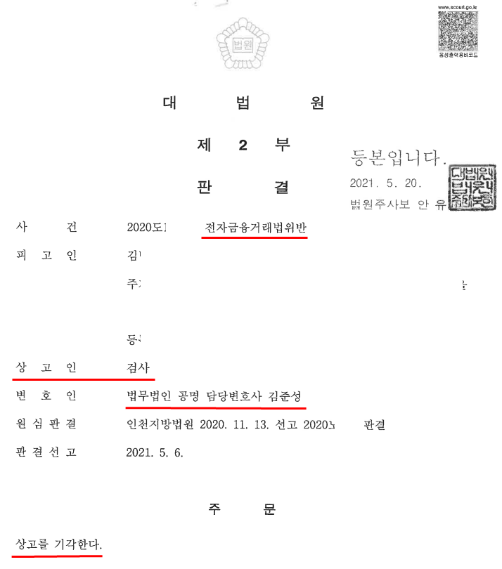 [전자금융거래법위반 혐의] : 김준성 변호사의 도움으로 검찰의 상고 기각(무죄 판결 확정)