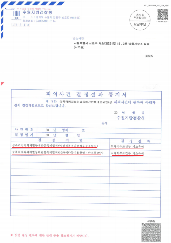 그러나 안내해드린 양형자료들과 선처를 호소하는 변호인의견서 및 경찰 조사 동행, 합의 진행을 통해 수원지방검찰청은 의뢰인님에게 "기소유예처분"을 내렸습니다. 이로 인해 의뢰인님께서는 전과 기록이 남지도 않고, 신상정보 공개, 고지, 등록 대상도 되지 않았습니다.