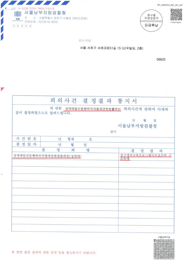 의뢰인님께서는 최근 성매매 처벌 수위에 비추어 벌금형이 선고될 위험이 높은 상황이었습니다. 그러나 앞서 말씀드린 다양한 방법으로 경찰, 검찰 수사 단계를 신중히 진행하였고 이에 서울남부지방검찰청은 의뢰인님에게 "기소유예"처분을 내렸습니다.