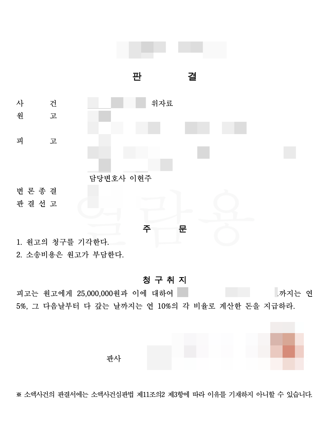의뢰인의 전부 승소로 종결됐습니다. 해당 배우자의 2,500만 원 청구는 전부 기각됐습니다.
