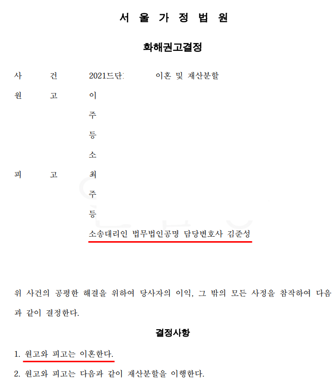 [이혼 소송 피고 대리] : 김준성 변호사의 도움으로 화해권고결정
