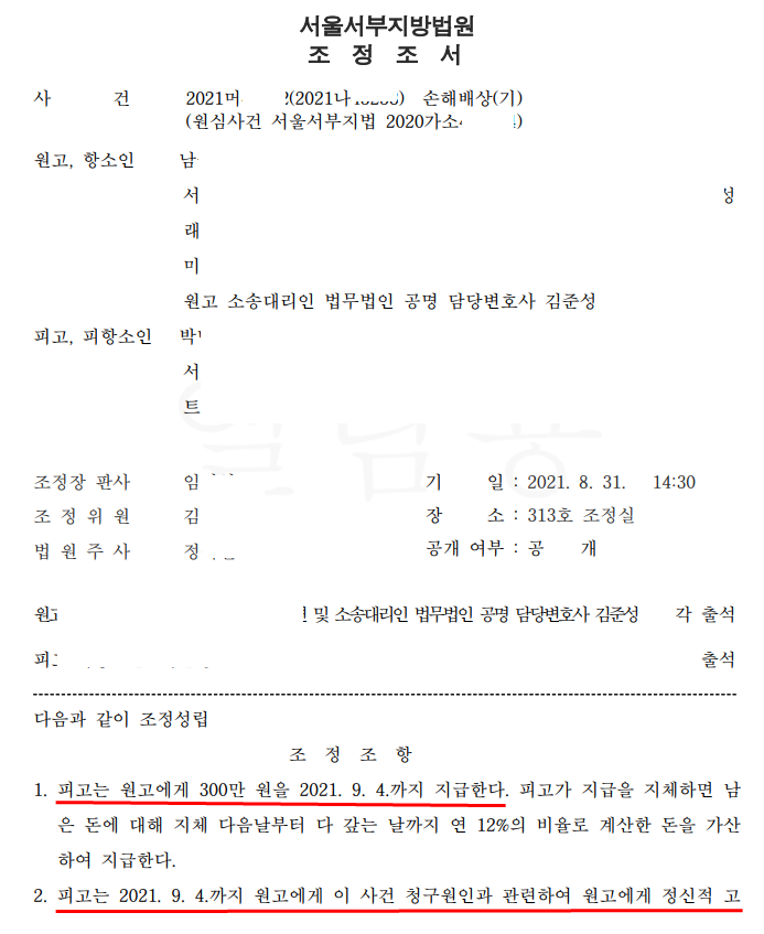 [손해배상(기) 사건 원고 소송 대리] : 김준성 변호사의 도움으로 조정성립