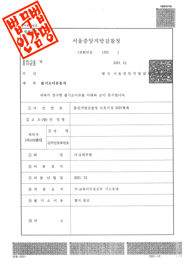 춘천지방검찰청 속초지청은 이 사건에 대해 다음과 같은 사유로 불기소 처분을 하였습니다.