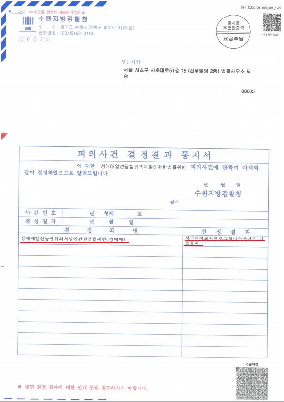 의뢰인님께서는 최근 성매매 처벌 수위에 비추어 벌금형이 선고될 위험이 높은 상황이었습니다. 그러나 앞서 말씀드린 다양한 방법으로 경찰, 검찰 수사 단계를 신중히 진행하였고 이에 서울남부지방검찰청은 의뢰인님에게 "기소유예"처분을 내렸습니다.