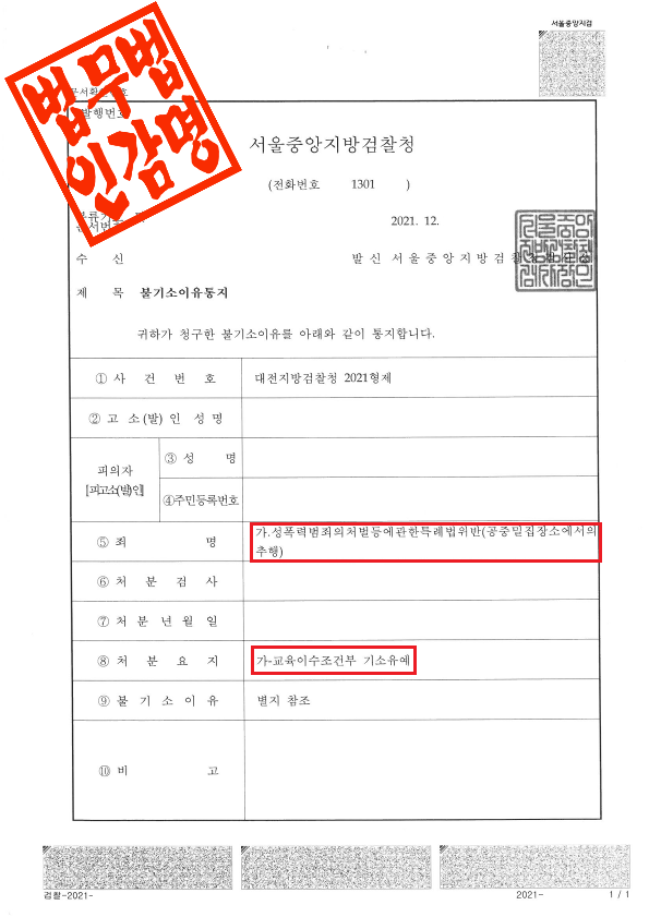 대전지방검찰청은 이 사건에 대해 다음과 같은 사유로 불기소 처분을 하였습니다.