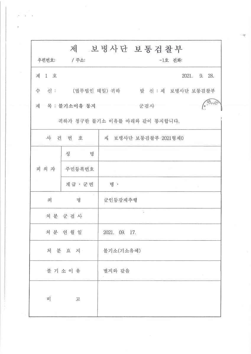 특히 군형법상 강제추행의 경우 성기와 관련이 되어 있는 경우 합의가 되더라도 거의 구공판이 되고 있는 현실이며 기소유예를 받기는 쉽지 않습니다. 아래 사건의 경우 군사경찰 조사에 입회하고 군검찰 조사까지 입회하여 최선을 다해 군검사님을 설득한 결과 어렵게 기소유예라는 선처를 받을 수 있었습니다.