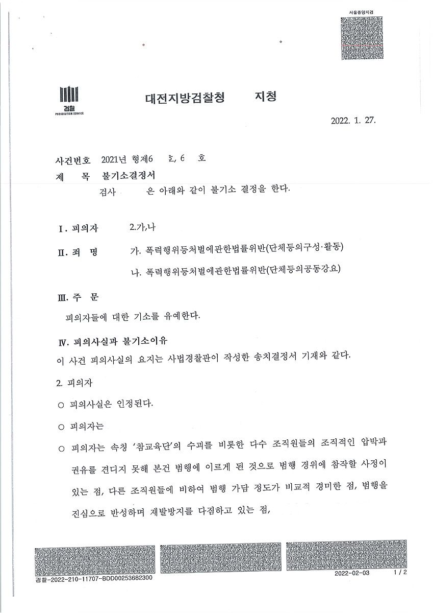 추가적으로 참교육단에 참여한 사람에 대하여 기소유예라는 선처를 받은 사례가 있었습니다. 먼저 참교육단 관련하여서는 제가 포스팅하였던 바 있고 YTN보도에 제가 자문을 하기도 하였습니다. 주범들에 대하여는 13년과 5년이라는 처벌이 내려졌습니다.